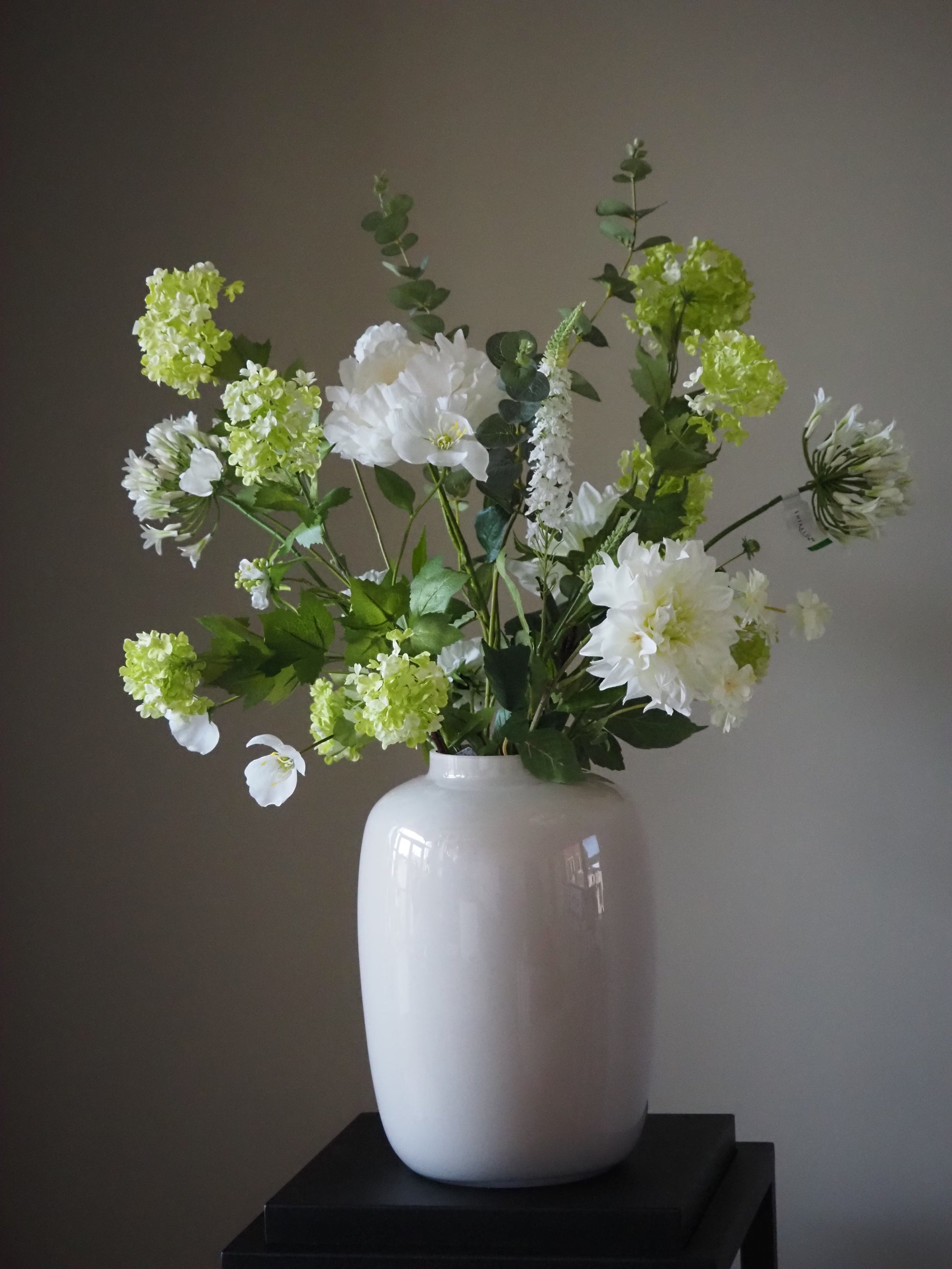 Dit boeket is neutraal en straalt rust uit, stijlvol en tijdloos met witte en groene tinten. Altijd mooi of het nu in een gekleurde, lichte of gouden vaas staat, dit boeket is in 2 verschillende maten te krijgen.